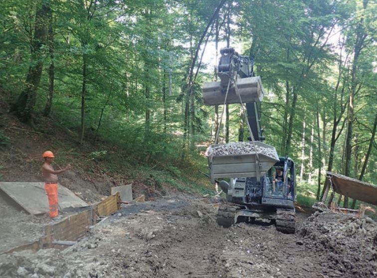 Die Erstellung der eigentlichen Fassung der Quelle bedarf viel Erfahrung. Tief im Boden muss beobachtet werden, wo das Wasser aus dem Hang tritt. Es braucht grosses «Gschpüri», um die Rinnsale, die aus der Grabenwand hervortreten, als Quellwasser zu erkennen. Tief unter der Erde auf der Grabensohle und an der Grabenwand muss mit Lehm abgedichtet werden, um das Quellwasser der neuen Sickerleitung zuzuleiten. Publireportage